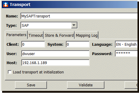 - 填写参数后,单击 Validate(验证)。将尝试与 SAP 企业应用服务器所在的计算机进行通信。如果未收到任何错误,则表明计算机已识别。