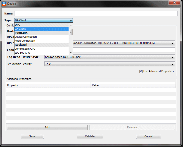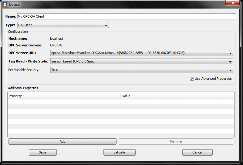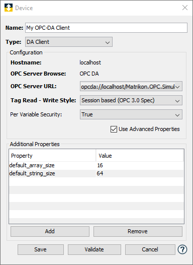 如果需要,选择 True 启用此功能。有关更多信息,请参见设置每个设备变量的读写。 - 选择 Validate(验证)以验证参数并连接到 OPC-DA 服务器应用程序。如果连接到 OPC-DA 服务器时出现问题,则将显示错误代码。