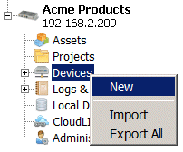 - 选择 Devices(设备)图标以显示 Devices(设备)面板,右键单击 Devices(设备)图标以显示其弹出菜单,然后选择 New(新建)。
