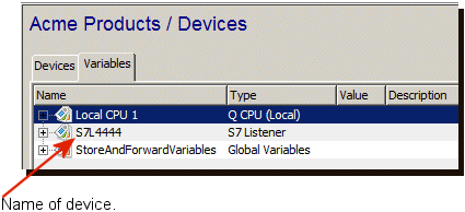 | Name(名称) | 这是设备的名称。如果设备未处于 Started(启动)状态,则 Variables(变量)选项卡中不会列出该设备。展开设备的结构时,将显示内部结构和变量。 |