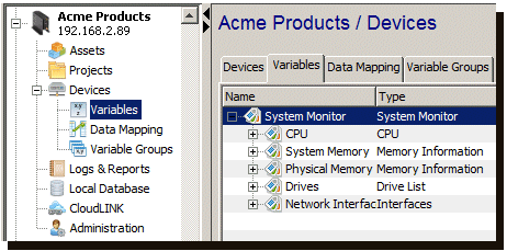 - 在工作台左侧窗格中,展开想要查看或更改其设备变量的节点。