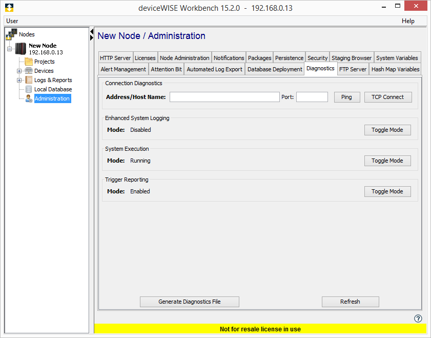 确保 CODESYS PLC 在线且已启动。尝试从已安装驱动程序的节点上对 CODESYS PLC 的 IP 地址进行 ping 操作。此操作可从工作台的 Administration(账户管理)-> Diagnostics(诊断)面板完成。
