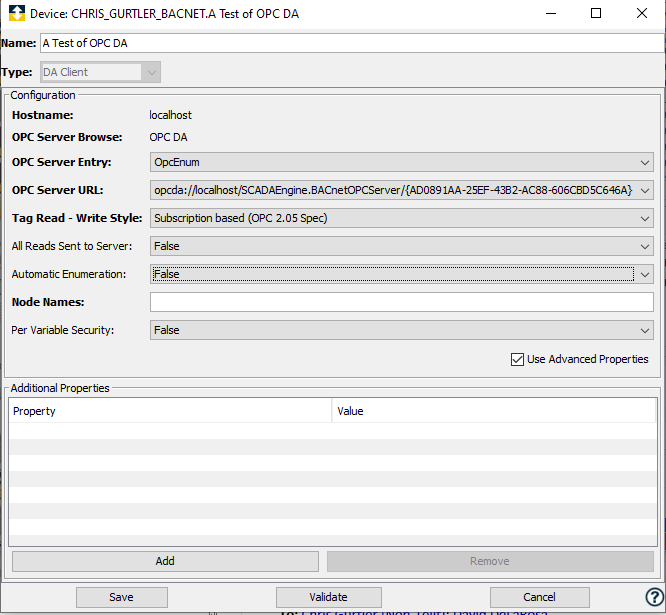 如果需要,选择 True 启用此功能。有关详细信息,请参见设置每个设备变量的读写。Node Names 采用 OPC 标记名称的形式的分支路径列表,以逗号分隔,需要包含在枚举中。也将枚举每个列出的路径下的所有子标签。 - 选择 Validate(验证)以验证参数并连接到 OPC-DA 服务器应用程序。如果连接到 OPC-DA 服务器时出现问题,则将显示错误代码。