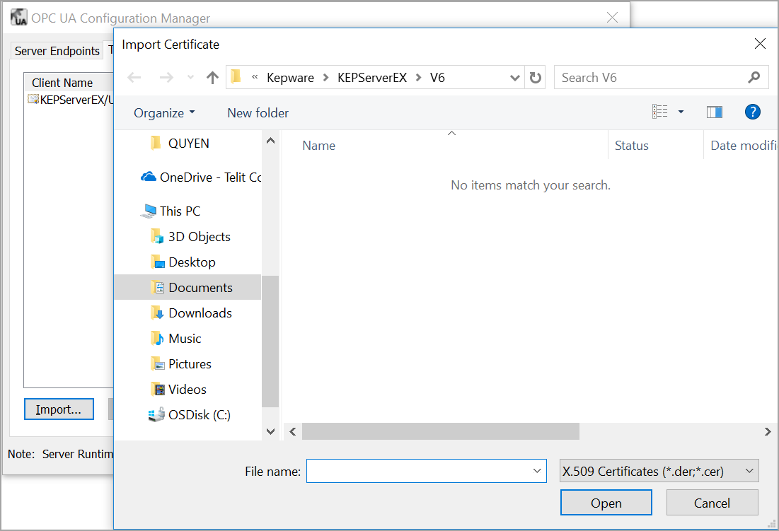 - 选择要在服务器上受信任的证书文件(*.der 或 *.cer)。此项文件为客户端的证书。可在暂存目录 /uaclient/pki/own/uaclientcert.der 下找到该 deviceWISE OPC UA 客户端的证书。
