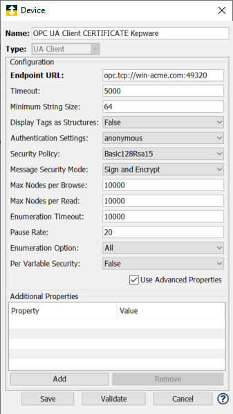 - 设置一台 OPC UA 客户端设备,其安全策略设置为连接到 Kepware OPC UA Server。