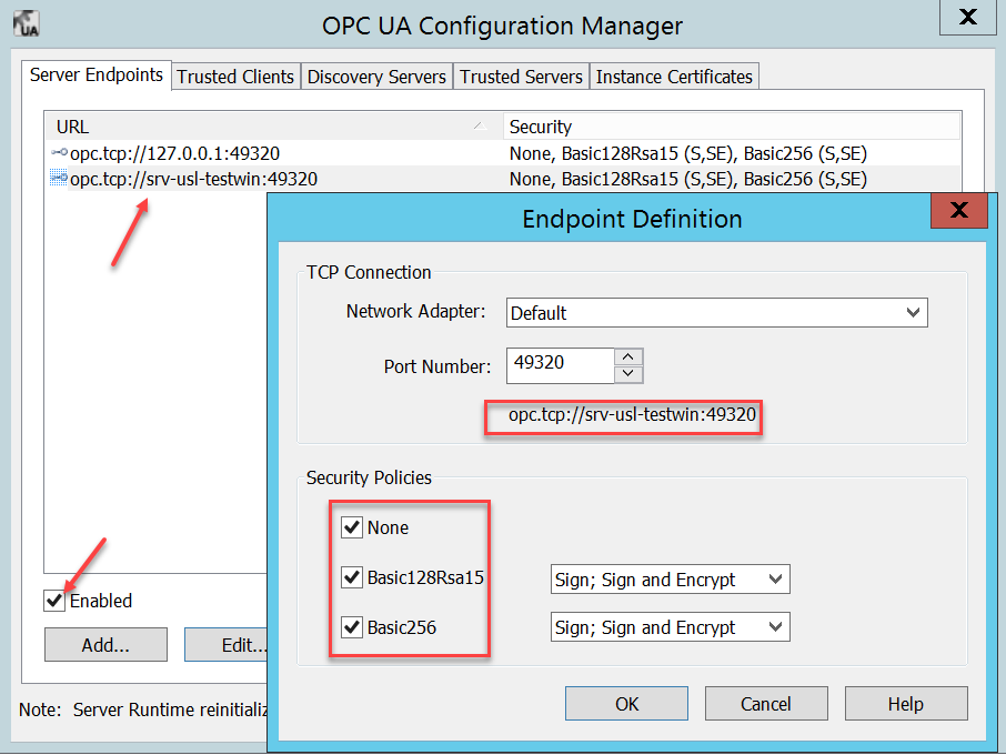 - 检查 deviceWISE 节点上的 DNS 设置,确保访问的是完整的主机名(例如:opc.tcp://N3966.tmt.telital.com:49320)。例如,当安全策略为 None(无)时,试图在无身份验证的情况下连接到服务器。