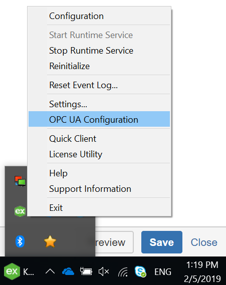 - 右键单击 Windows 任务栏,并选择 OPC UA Configuration(OPC UA 配置)