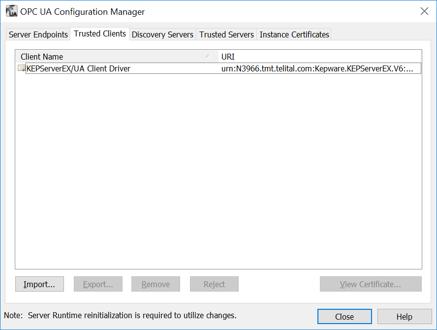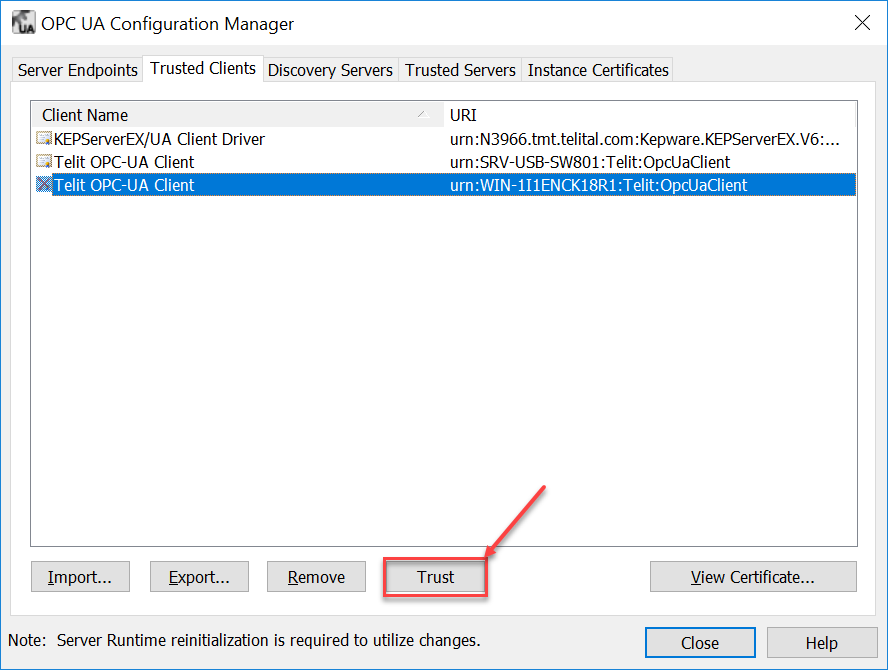 开启 OPC UA 配置管理器,选择客户端证书,并单击 Trust(信任)。重启服务器。