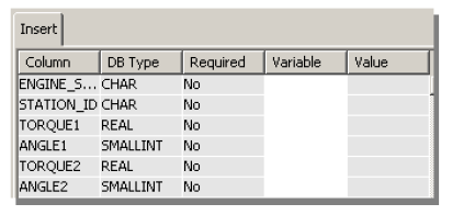 在此例中,从 Action(动作)下拉列表中选择 Insert(插入)操作。假定您已经创建了一组映射变量,并且它们显示在 Input(输入)选项卡上。