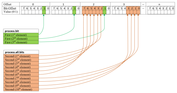 { "First" : {"offset":0, "type":"BOOL", "count":3, "bit_offset":1, "special":"process.bit" }, "Second" : {"offset": 2, "type":"BOOL", "count":10, "bit_offset":2, "special":"process.all.bits" } }