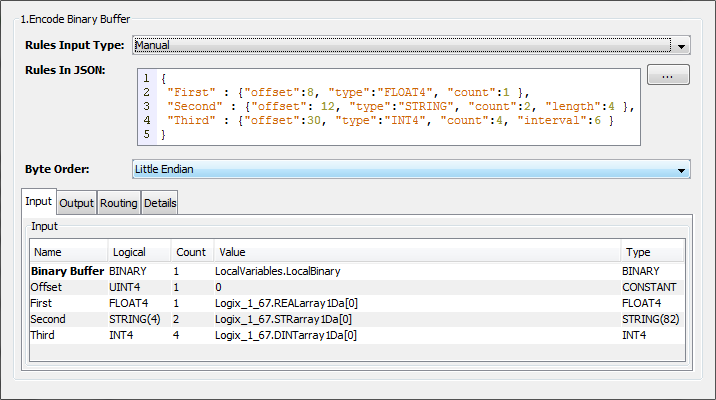 | Rules in JSON(JSON 中的规则) | 当 Rules Input Type(规则输入类型)为 Manual(手动)时,此参数用于指定要编码入二进制缓冲区的变量的 JSON 描述。如示例所示,各变量指定方式如下: