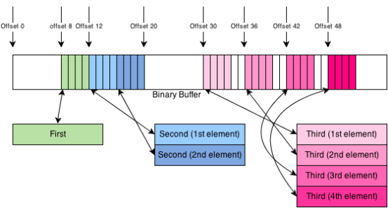 此示例显示了变量的 JSON 描述以及数据写入输出二进制缓冲区时的位置。