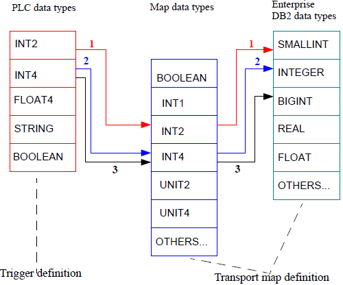 下面显示了如何将 PLC 的数据类型映射到 DB2 数据库数据类型。