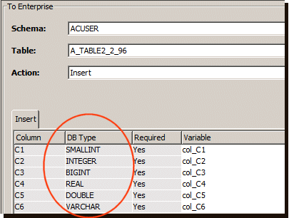 各种受支持的企业应用产品(包括 IBM DB2、DB2 400、Oracle、Microsoft SQL Server 和 MySQL)都有相关的数据类型。在定义企业有效负载的映射变量时,将看到这些数据类型。