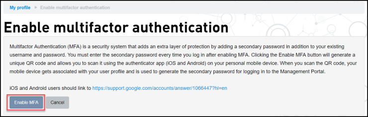 随即显示 Enable multifactor authentication(启用多因素身份验证)界面,其中包含 MFA 的描述文本 - 单击 Enable MFA(启用多因素身份验证)