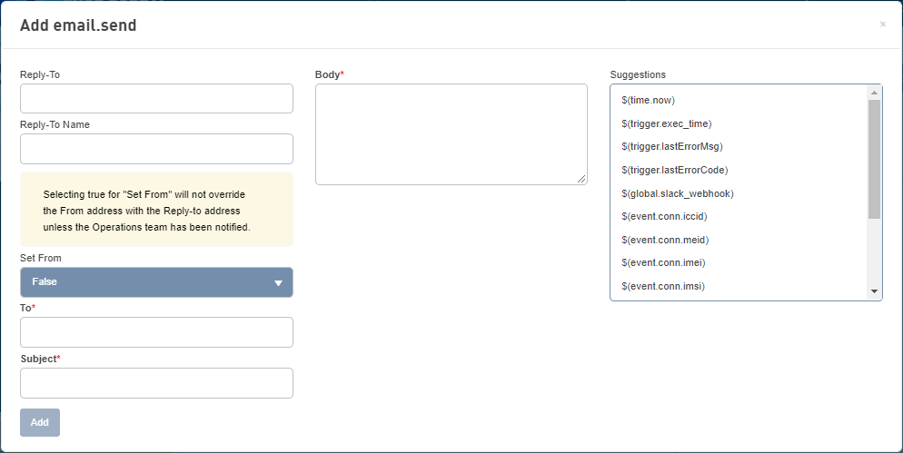 默认情况下,此参数设置为 False。 False:当设置为 False 时,From(发件人)字段中将显示默认电子邮件地址。例如,物联网设备管理平台 <noreply@Telit.com> True:当设置为 True 时,Reply-To(回复给)地址将设置为 from(发件人)电子邮件地址。要使此设置生效,需要进行内部配置。 为 Set From(设置发件人)选择 true 不会用 Reply-to(回复给)地址覆盖 From(发件人)地址,除非已通知运维小组。 |