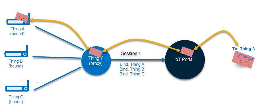 当代理与物联网设备管理门户建立了连接后,绑定到代理物的所有物都将通过代理的连接从物联网设备管理门户接收数据。 代理会启动会话绑定,通过发送 thing.bind 将物绑定到当前会话。例如,在下图中,当邮件发送到物 A 时(使用 method.exec 或 mailbox.send),就会使用有效的会话 ID 建立会话。物联网设备管理门户使用此会话将邮件发送到物 Y(代理),即物 A、物 B 和物 C 的虚拟表示形式。随后,物 Y 会使用已建立的通信路径将邮件发送到物 A。